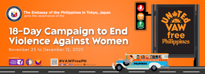 The Philippine Embassy in Japan joins the 18-Day Campaign to End Violence Against Women (VAW) from 25 November to 12 December, reaffirming our commitment to protect the rights, dignity, and safety of all women and girls.