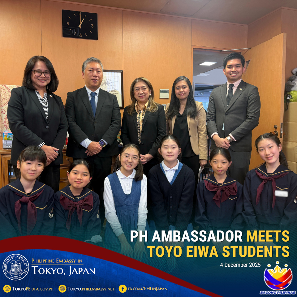 2025年11月7日東洋英和女学院小学部の国際交流クラブ児童が在日フィリピン大使館を訪問、フィリピン語と文化について理解を深めたことを受け、大使は同学校より返礼訪問の招待を受けました。