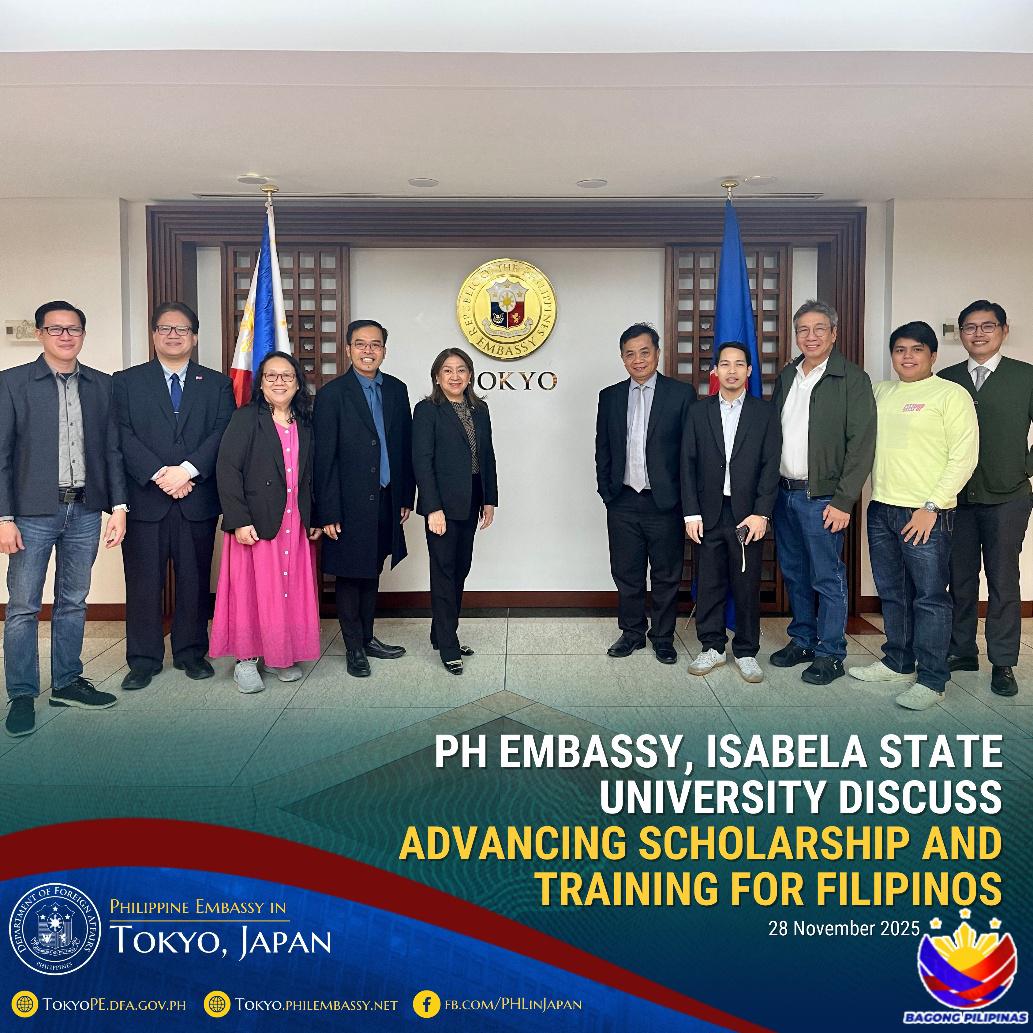 2025年11月28日イサベラ州立大学(ISU)のボイエット・L・バタン学長(左から4番目率いる教授団が在日フィリピン大使館にて、ミレーン・ガルシア=アルバノ駐日フィリピン大使(左から5番目)を表敬訪問しました。両者は、ISUと日本の大学との間で進行中および将来的な学術・研究協力について協議を行いました。