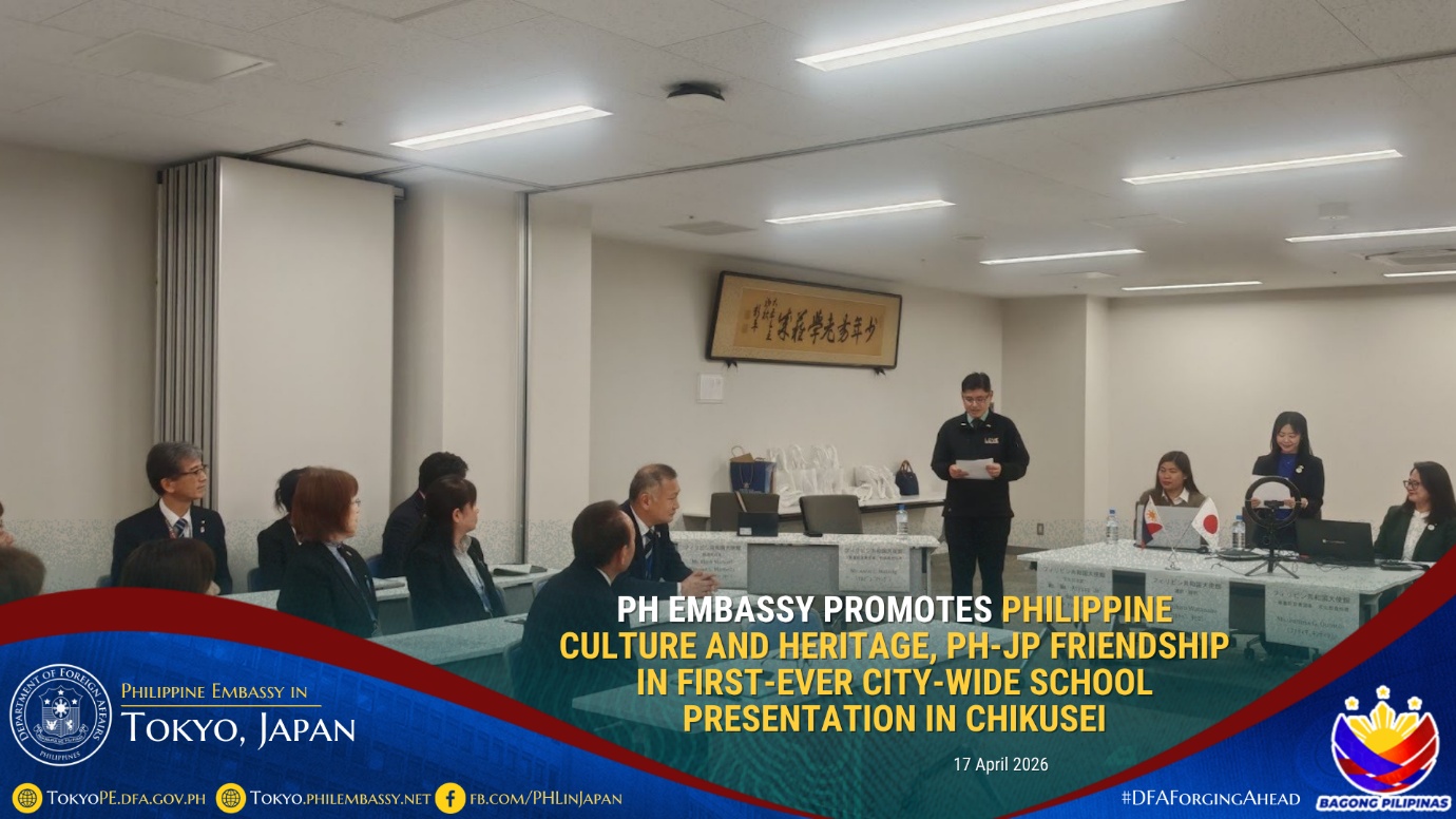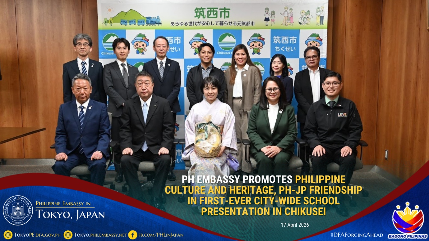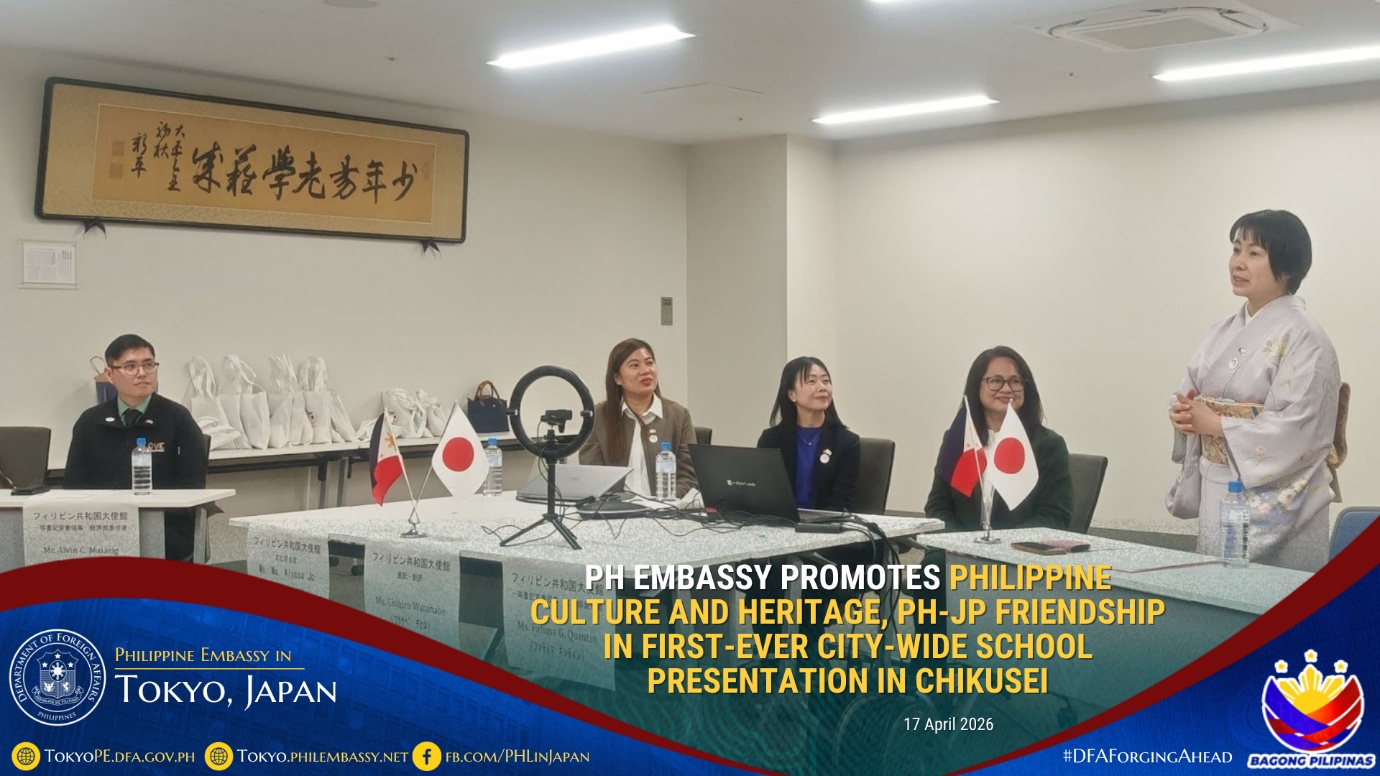 2026年4月28日東京-在日フィリピン大使館の文化・経済外交活動の一環として、また今年迎える「日比友好70周年」を記念し、大使館は茨城県筑西市の招待を受け、2026年4月17日市内の全中学校を対象に、フィリピンの文化と遺産、および日比関係に関するオンライン授業を実施しました。