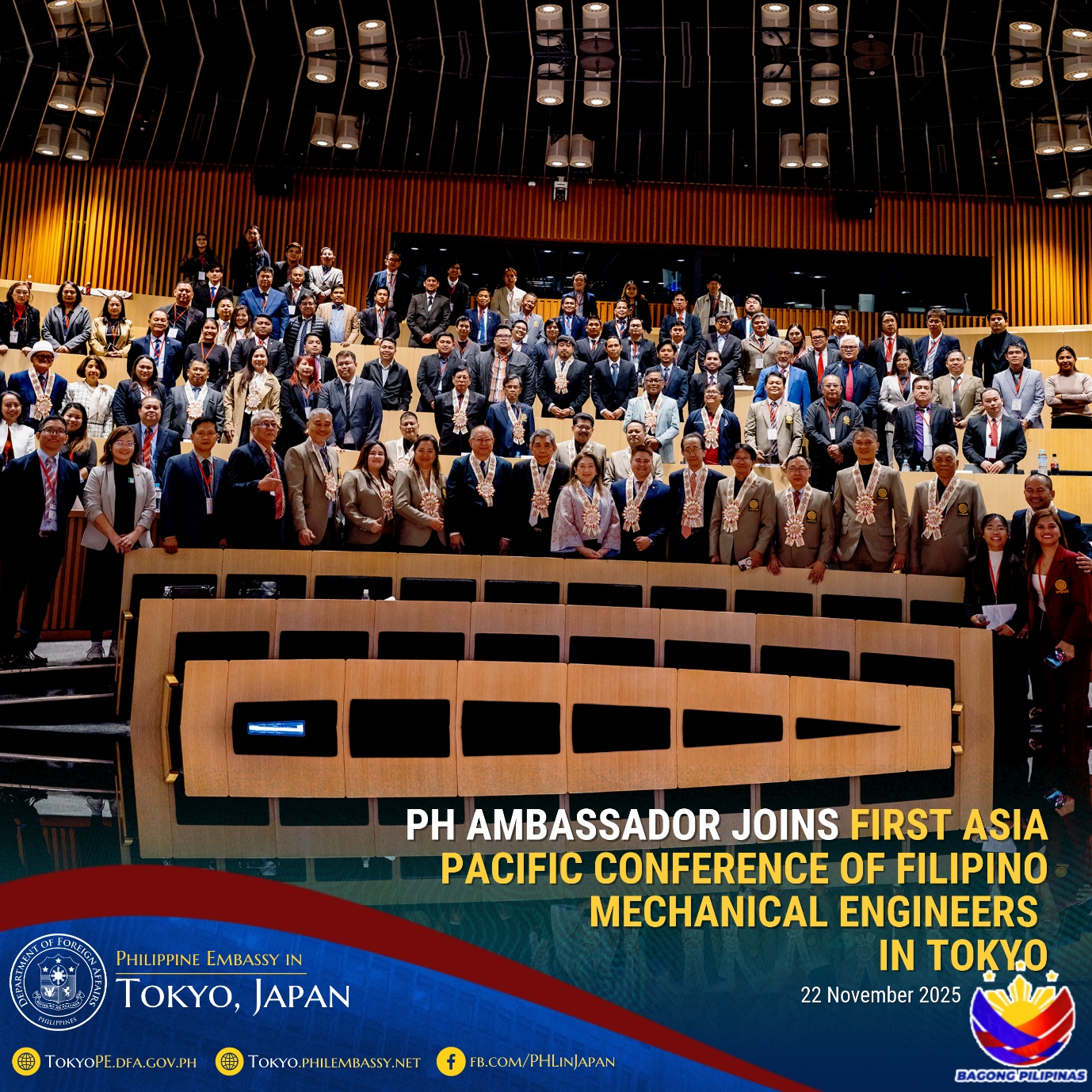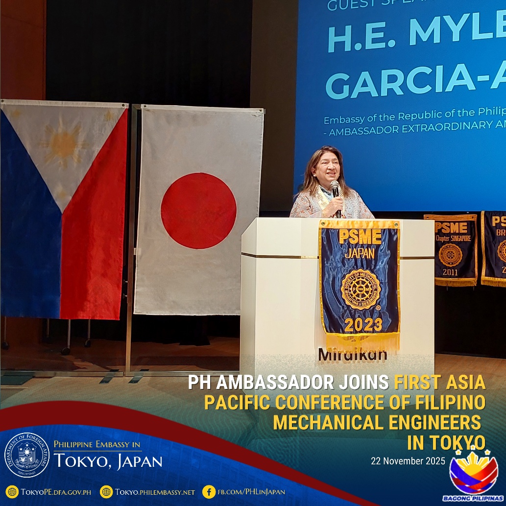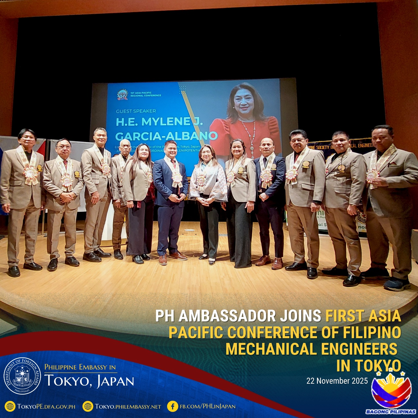 2025年11月28日東京-ミレーン・ガルシア=アルバノ駐日フィリピン大使は、2025年11月22日東京の日本科学未来館で開催されたフィリピン機械技術者協会(PSME)第1回アジア太平洋会議に出席しました。この会議にはアジア太平洋地域から150名のフィリピン人機械技術者が集結しました。