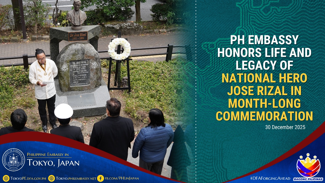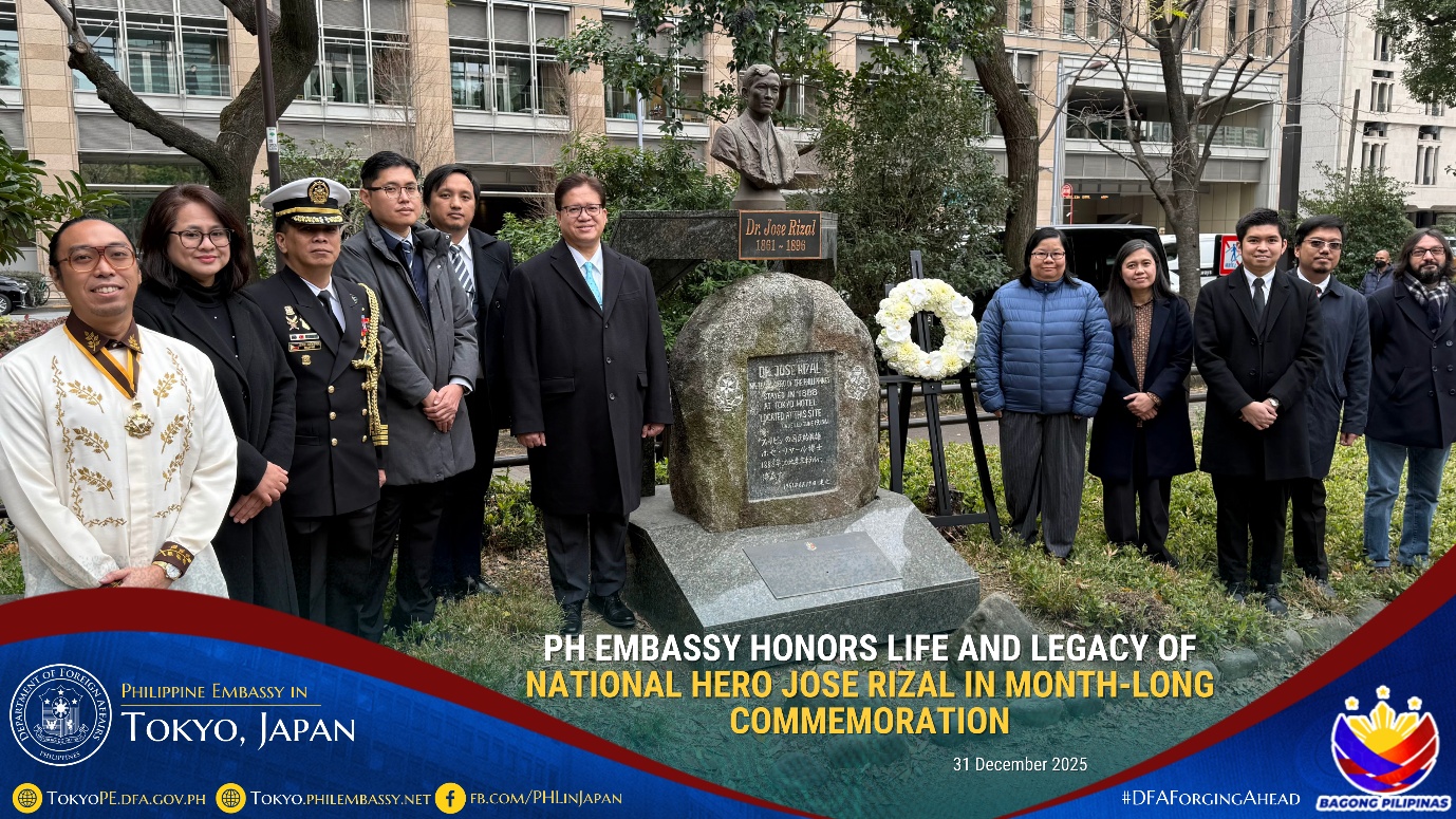 【東京、2025年12月30日】- フィリピンの国民的英雄であるホセ・リサール博士の生涯、業績、そして今日に至る不朽の遺産を称えるため、在日フィリピン大使館は、2025年12月11日に東京・日比谷公園のリサール記念碑において実施した献花式を皮切りに、1か月間にわたる記念行事を開催しました。