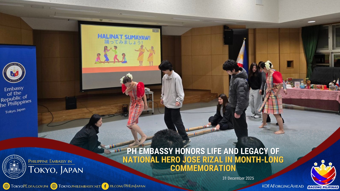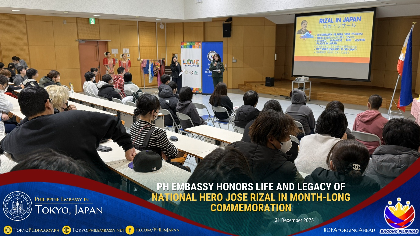 リサール記念日の関連行事の一環として、大使館は2025年12月16日、東京都立町田高等学校において、リサールと日本との出会いをテーマとした文化紹介プログラムを実施しました。働いている生徒や昼間課程への通学が困難な生徒で構成されており、参加者たちはフィリピンの文化、遺産、歴史、舞台芸術を紹介する双方向型セッションに積極的に参加しました。プログラムには、初歩的なフィリピン語レッスンのほか、東京外国語大学フィリピン民族舞踊団による伝統舞踊「itik-itik(イティク・イティク)」と「tinikling(ティニクリン)」の披露が含まれた。本行事は、日本のChildren Meet Countries団体との協力により実施されました。
