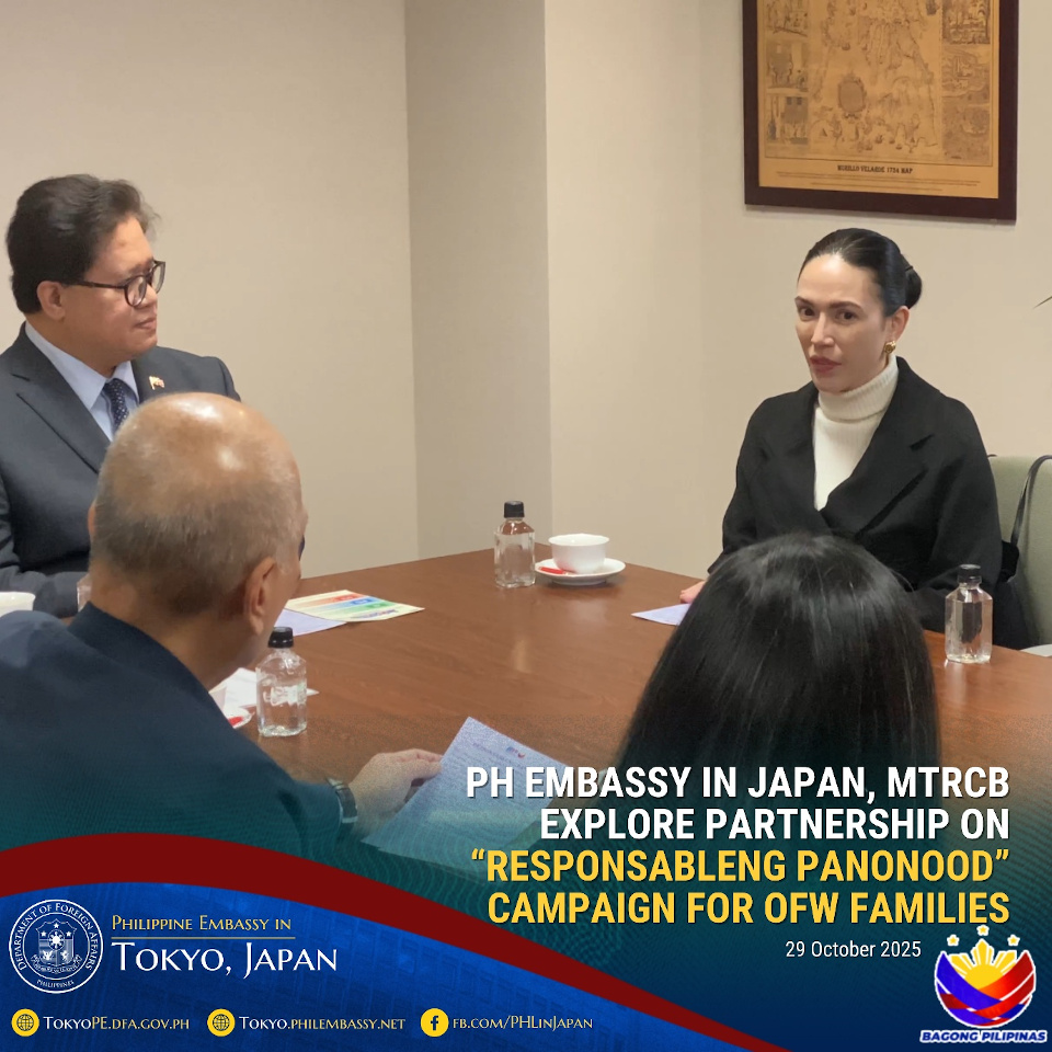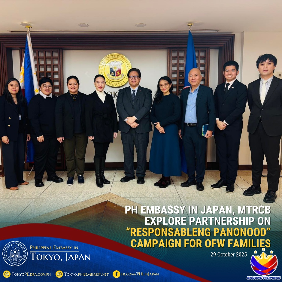 ミレーン・ガルシア=アルバノ駐日フィリピン大使に代わり、クリスチャン・L・デ・ヘスス臨時代理大使は、2025年10月29日、在東京フィリピン大使館において、映画・テレビ審査分類委員会(MTRCB)のディオレラ・マリア・“ララ”・G・ソット=アントニオ委員長兼CEO率いる同委員会代表団をお迎えしました。