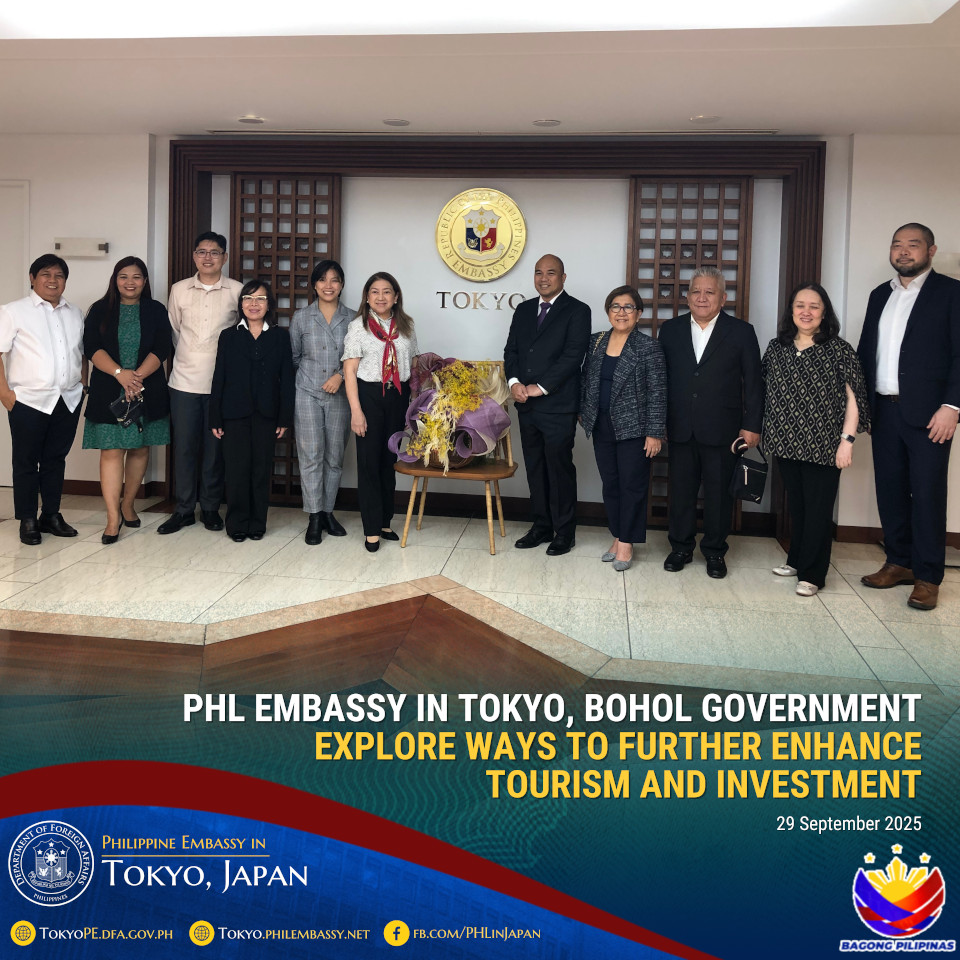 2025年10月3日東京―9月29日、ボホール州政府代表団がミレーン・ガルシア=アルバノ駐日大使を表敬訪問、ボホール州を主要な観光・投資先として推進する取り組みが議論の中心となりました。エリコ・アリストテル・アウメンタド知事率いる代表団は、特にハードロックカフェ東京店・名古屋店との商談、ならびに投資・観光促進会議を目的に来日しました。