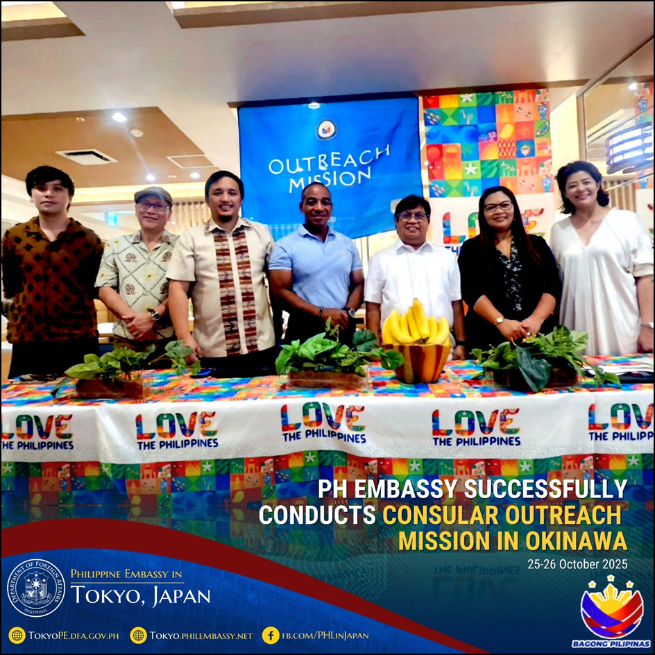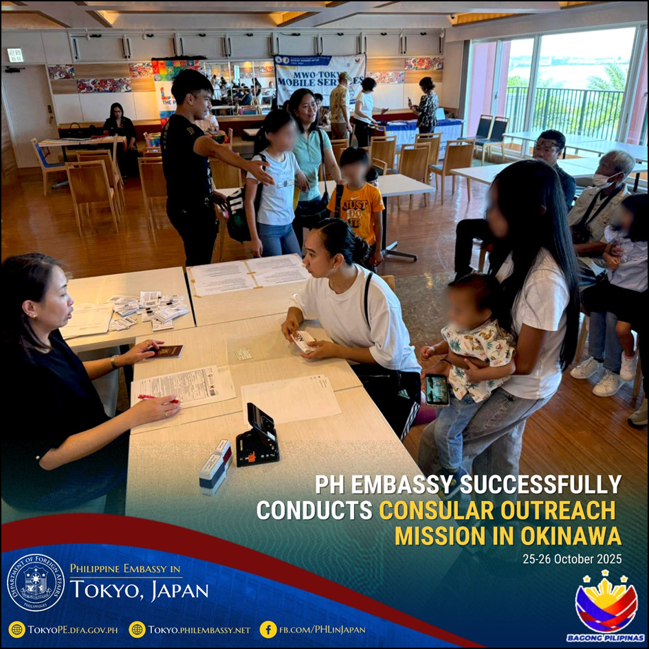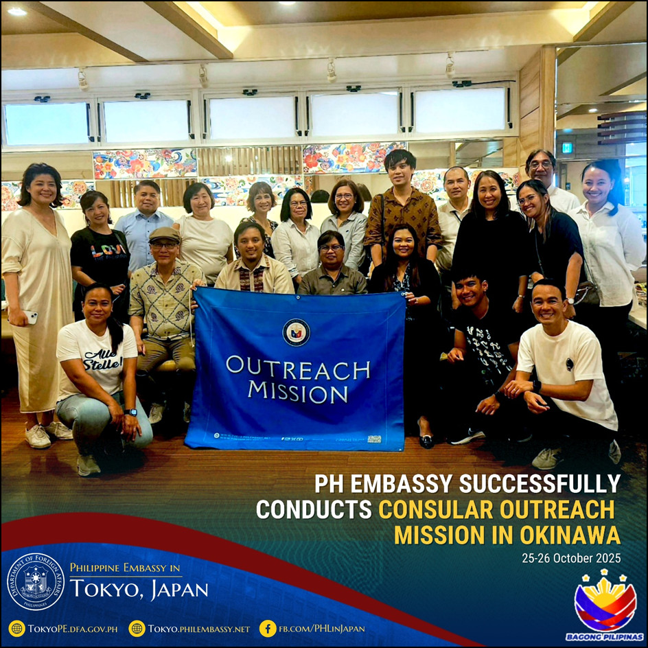 2025年10月25日、26日在京フィリピン大使館は関連機関及びフィリピン人ボランティアと共に、沖縄県北谷町美浜のベッセルカンパナホテルにて、領事出張サービスを成功裏に実施、フィリピン人コミュニティに対し177件の領事サービスを提供