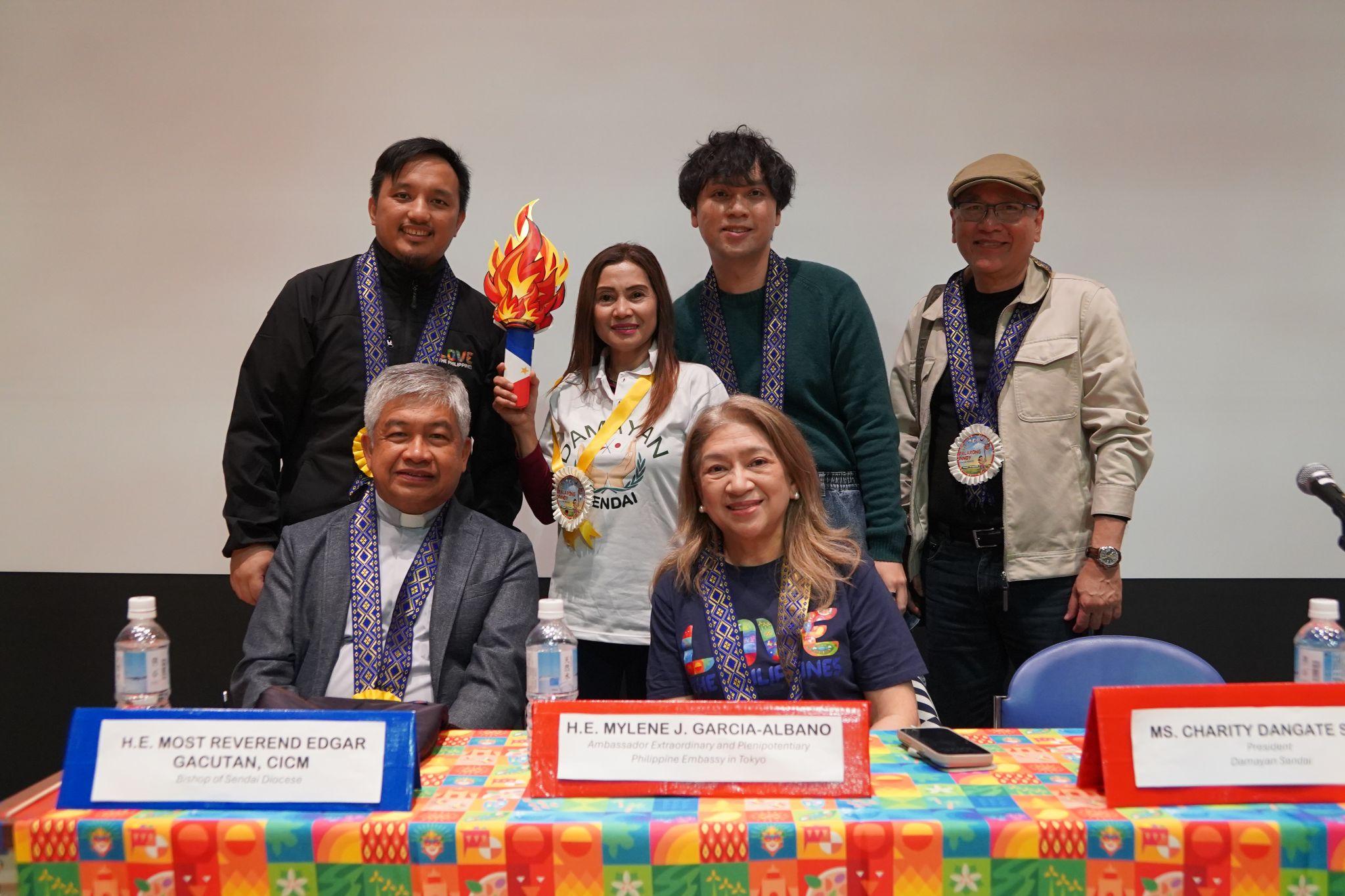 Philippine Ambassador to Japan Mylene J. Garcia-Albano (1st row-right), Most Reverend Edgar Gacutan, CICM, Bishop of Sendai Diocese (1st row-left), Acting Consul General Robert D. Quintin (2nd row-left), Labor Attaché Ramon Lamberto C. Pastrana (2nd row-right), Welfare Officer Geronico M. Herrera (2nd row-2nd from the right), and Ms. Charity Dangate Sato, President of Damayan (2nd row-2nd from the left) during the Palarong Pinoy in Tohoku Region in Sendai, Miyagi on 11 April 2026.