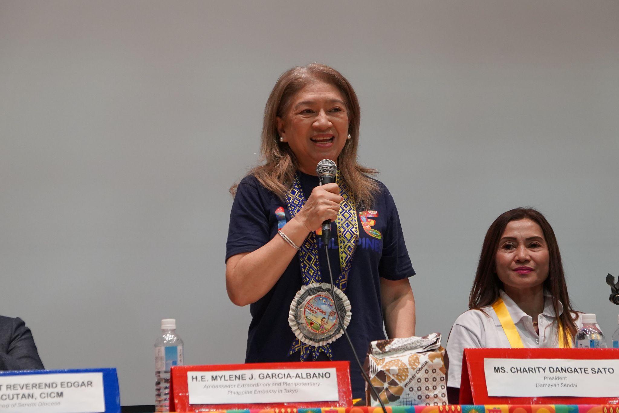 Philippine Ambassador to Japan Mylene J. Garcia-Albano (center) delivers her remarks during the Palarong Pinoy in Tohoku Region in Sendai, Miyagi.