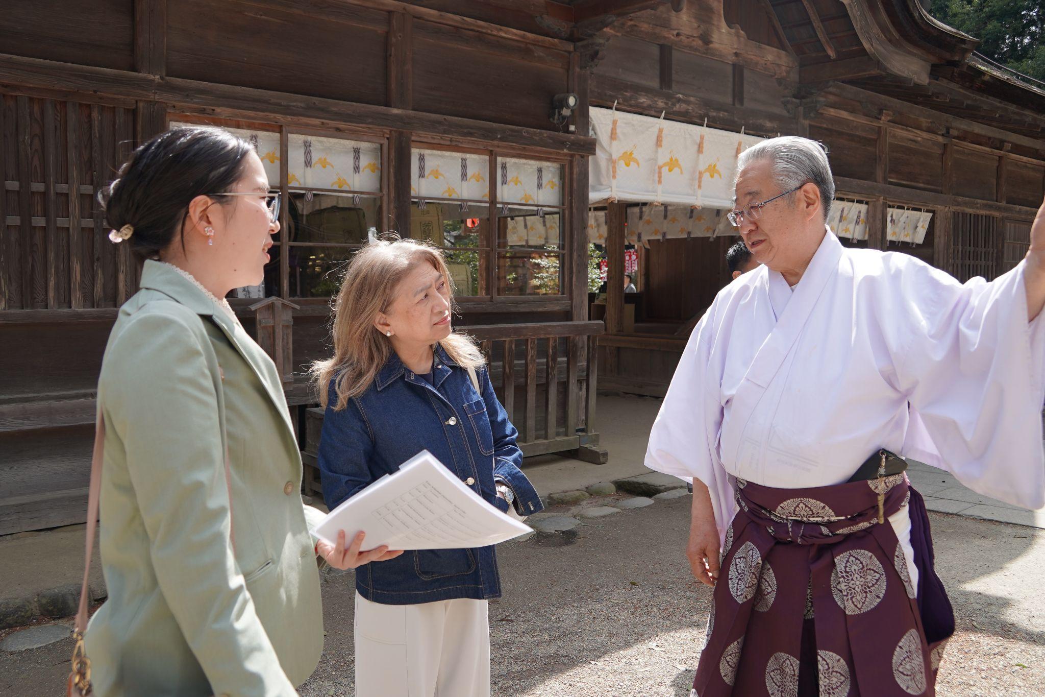 Philippine Ambassador to Japan Mylene J. Garcia-Albano (center), Osaki Hachimangu Shrine Chief Priest Hiroaki Onome (right), Ms. Saki Sakurai, graduate student from Tohoku University during the guided tour at Osaki Hachimangu Shrine.