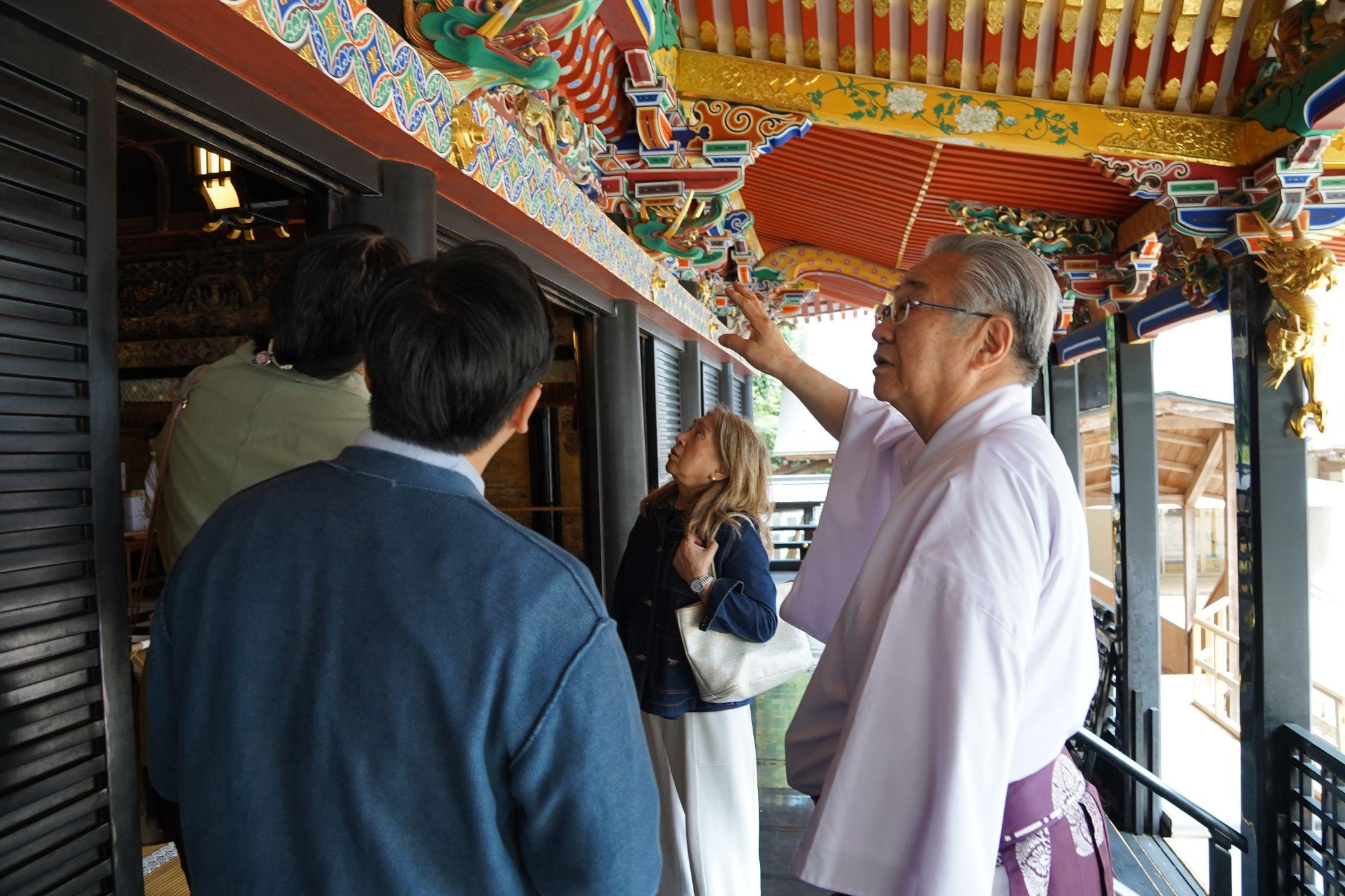 Philippine Ambassador to Japan Mylene J. Garcia-Albano (center), Osaki Hachimangu Shrine Chief Priest Hiroaki Onome (right) explains the architectural style and vibrant carvings of the Osaki Hachimangu Shrine.