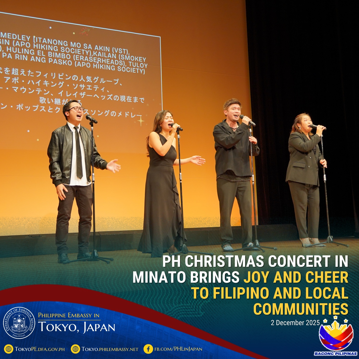 TOKYO, 11 December 2025 – To welcome the Christmas season, the Philippine Embassy in Japan, in partnership with Minato City, organized the annual Philippine Christmas Concert on 02 December 2025 at the Akasaka Civic Center in Minato City, Tokyo.