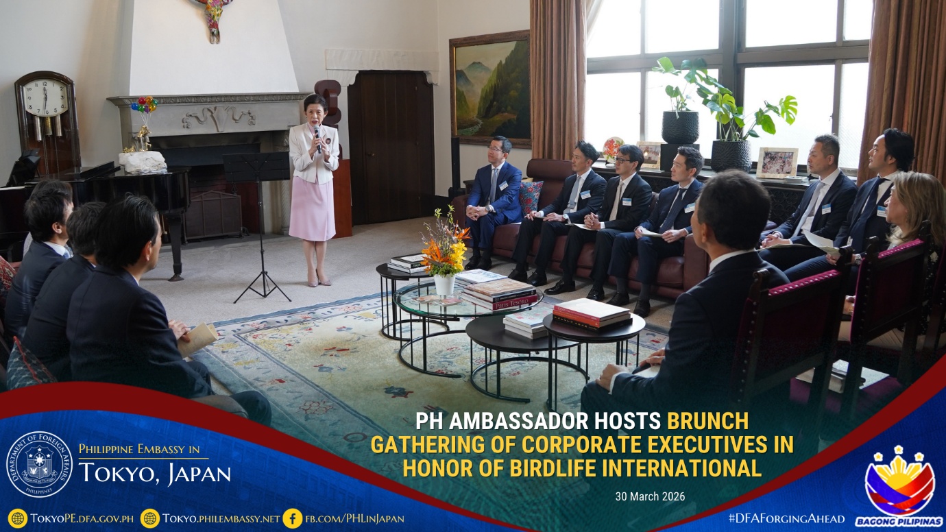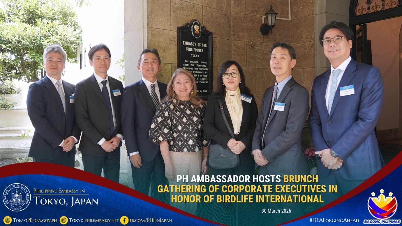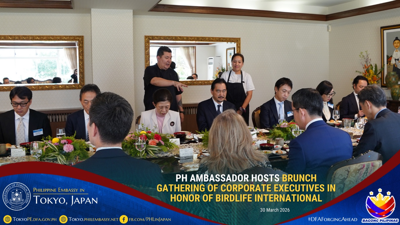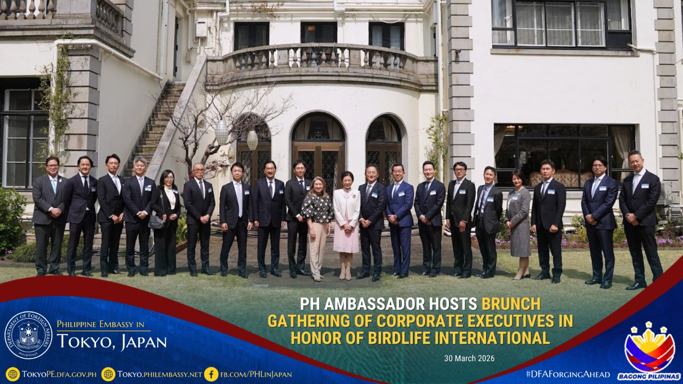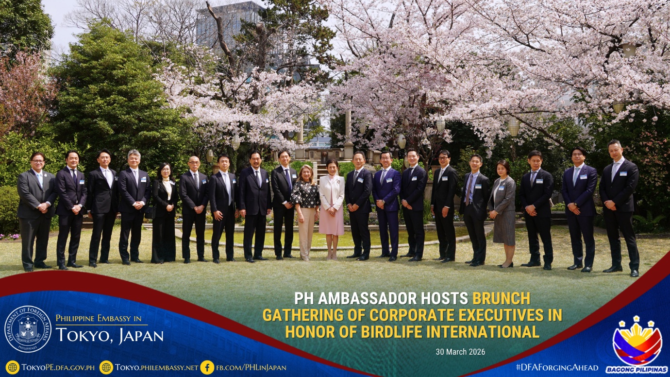 In honor of BirdLife International and its advocacies on environmental conservation, Philippine Ambassador to Japan Mylene J. Garcia-Albano hosted a brunch gathering on 30 March 2026 for corporate executives led by Mr. Eiji Sakaguchi, Chairman and Chief Executive Officer of the firm, CBRE K.K., together with the company’s invited guests composed of corporate executives based in Japan.