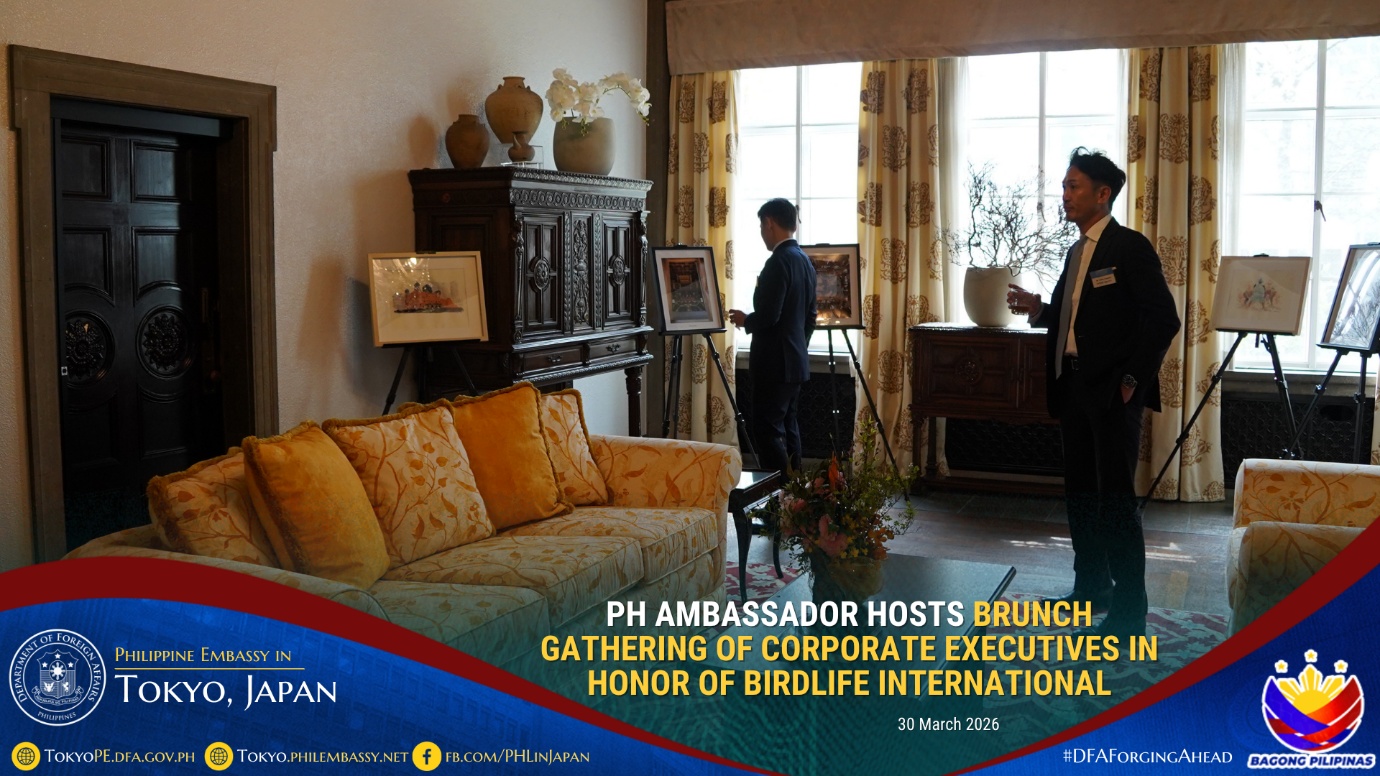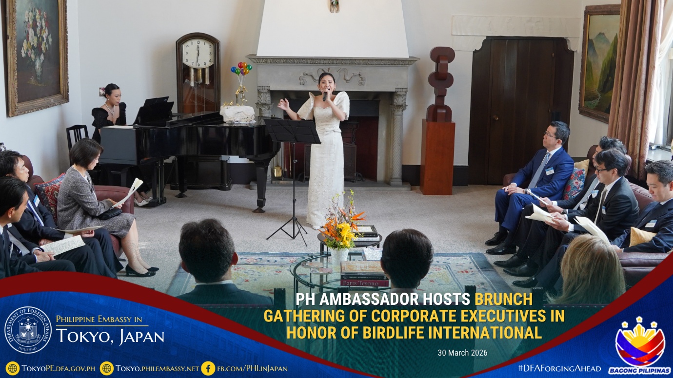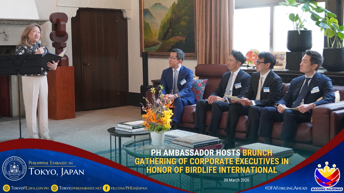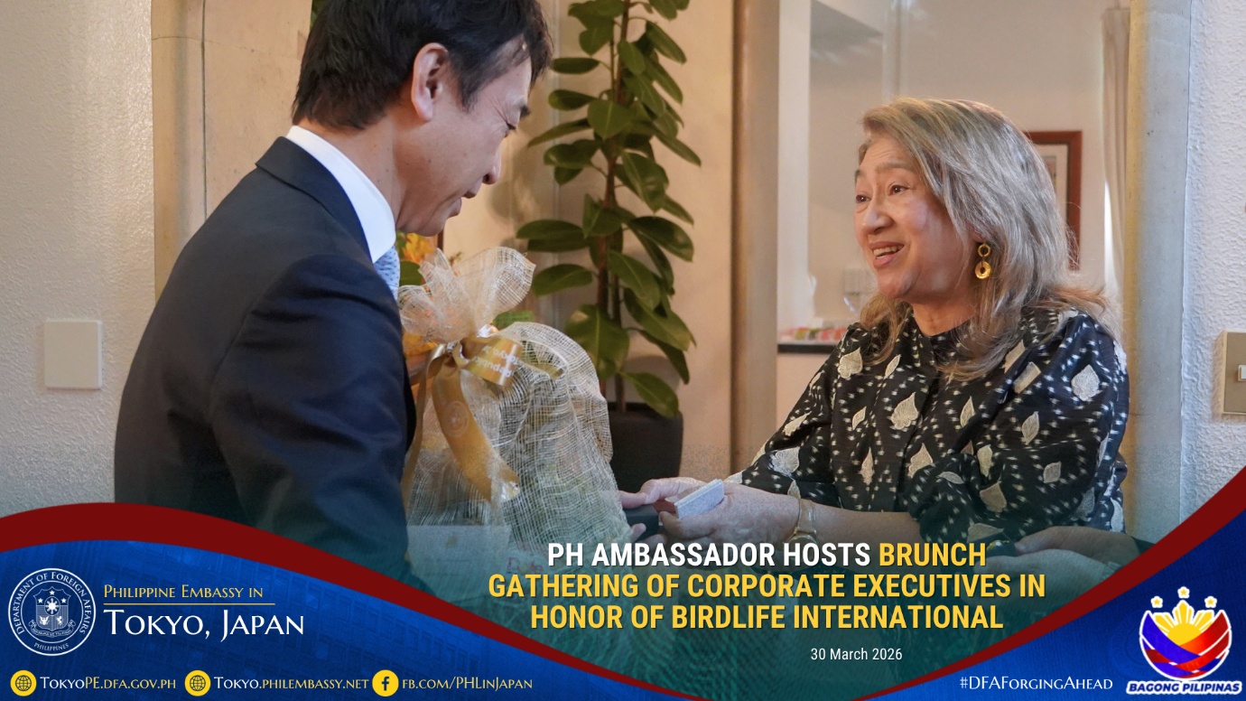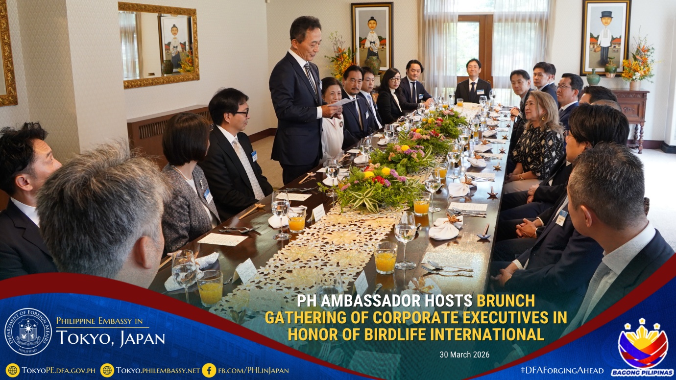 In honor of BirdLife International and its advocacies on environmental conservation, Philippine Ambassador to Japan Mylene J. Garcia-Albano hosted a brunch gathering on 30 March 2026 for corporate executives led by Mr. Eiji Sakaguchi, Chairman and Chief Executive Officer of the firm, CBRE K.K., together with the company’s invited guests composed of corporate executives based in Japan.