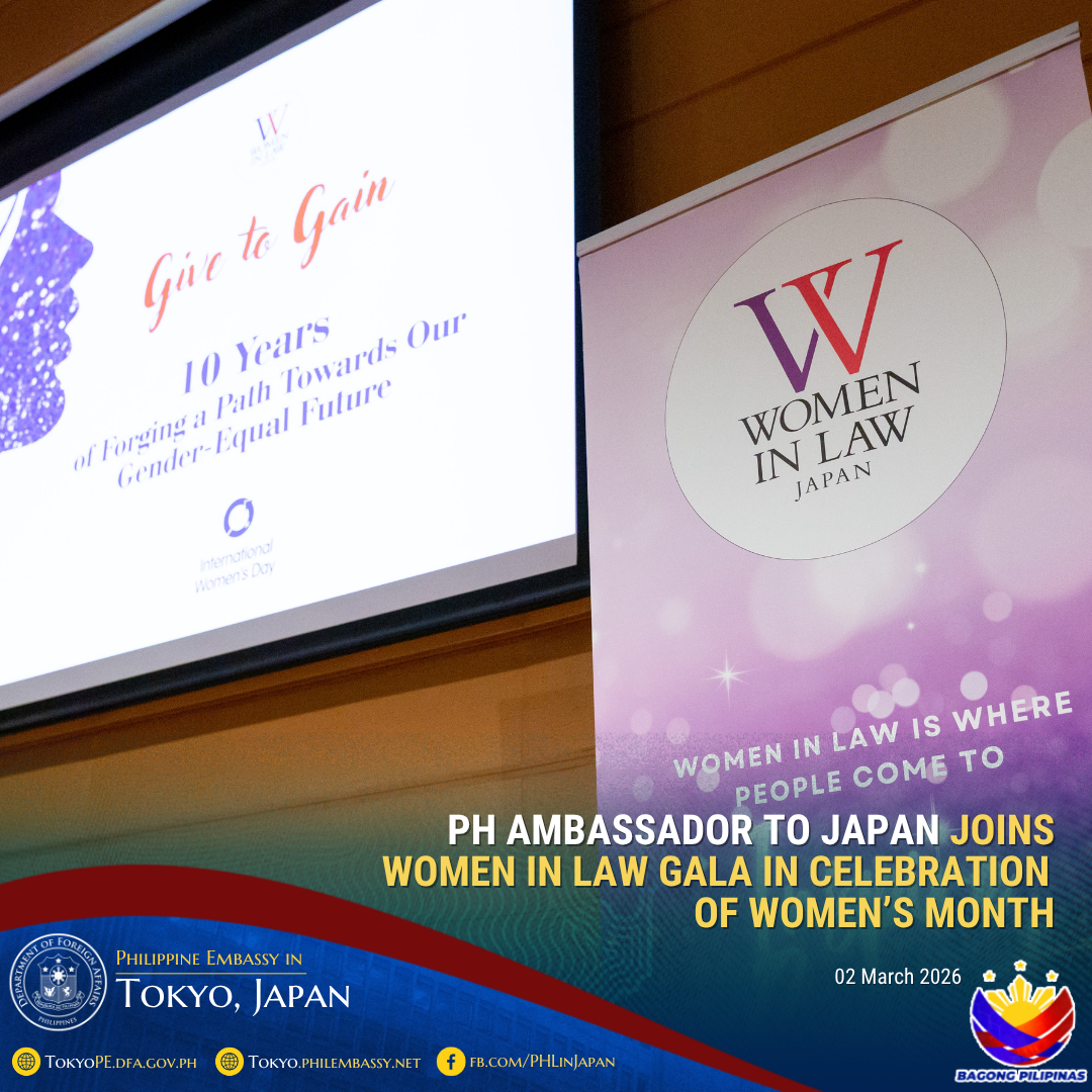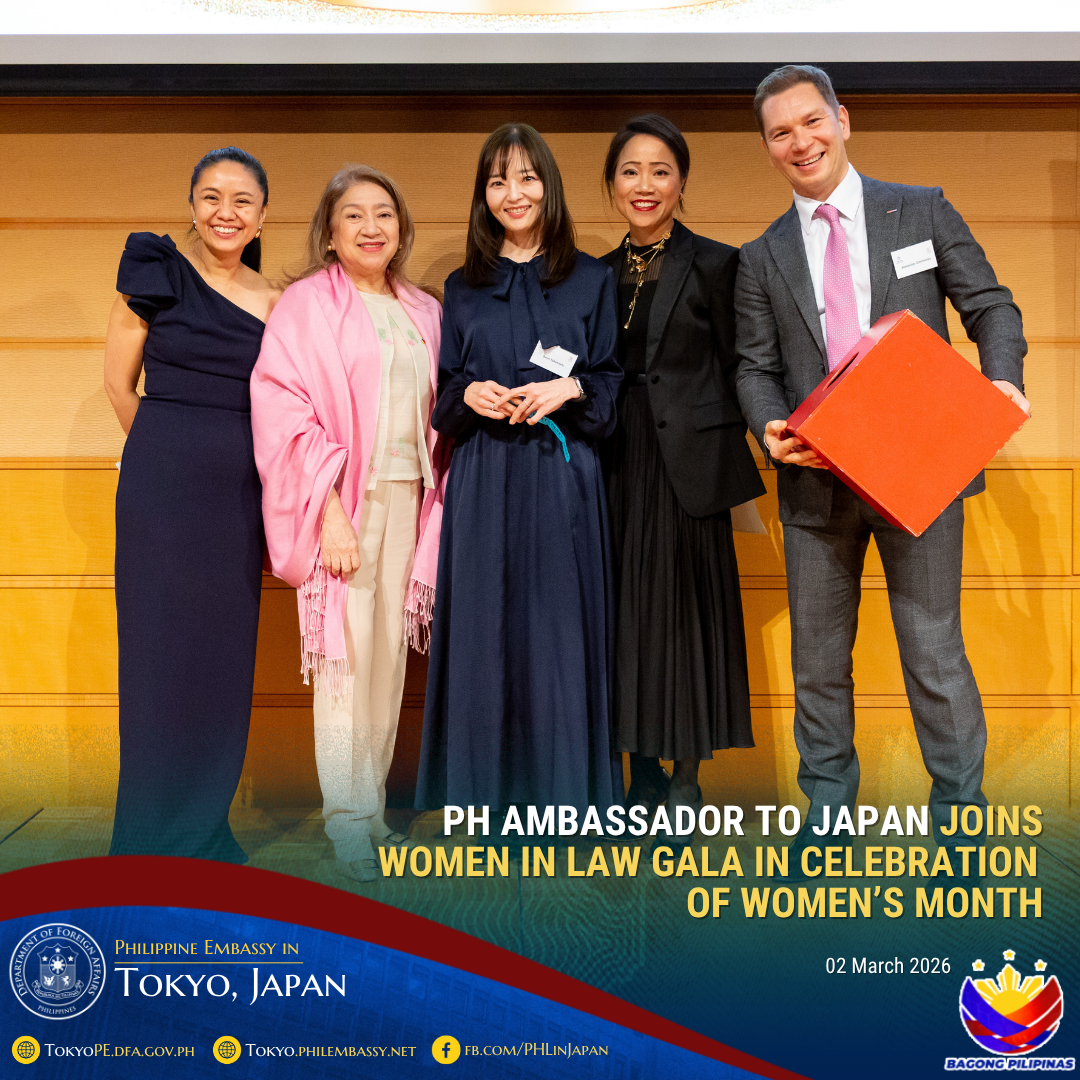 25 March 2026 – In celebration of National Women’s Month, Philippine Ambassador to Japan Mylene J. Garcia-Albano attended the Women in Law Japan (WILJ) 10th Anniversary Gala held on 2 March 2026 at the Tokyo American Club in Roppongi, Tokyo.
