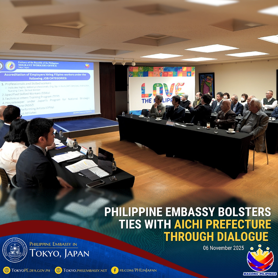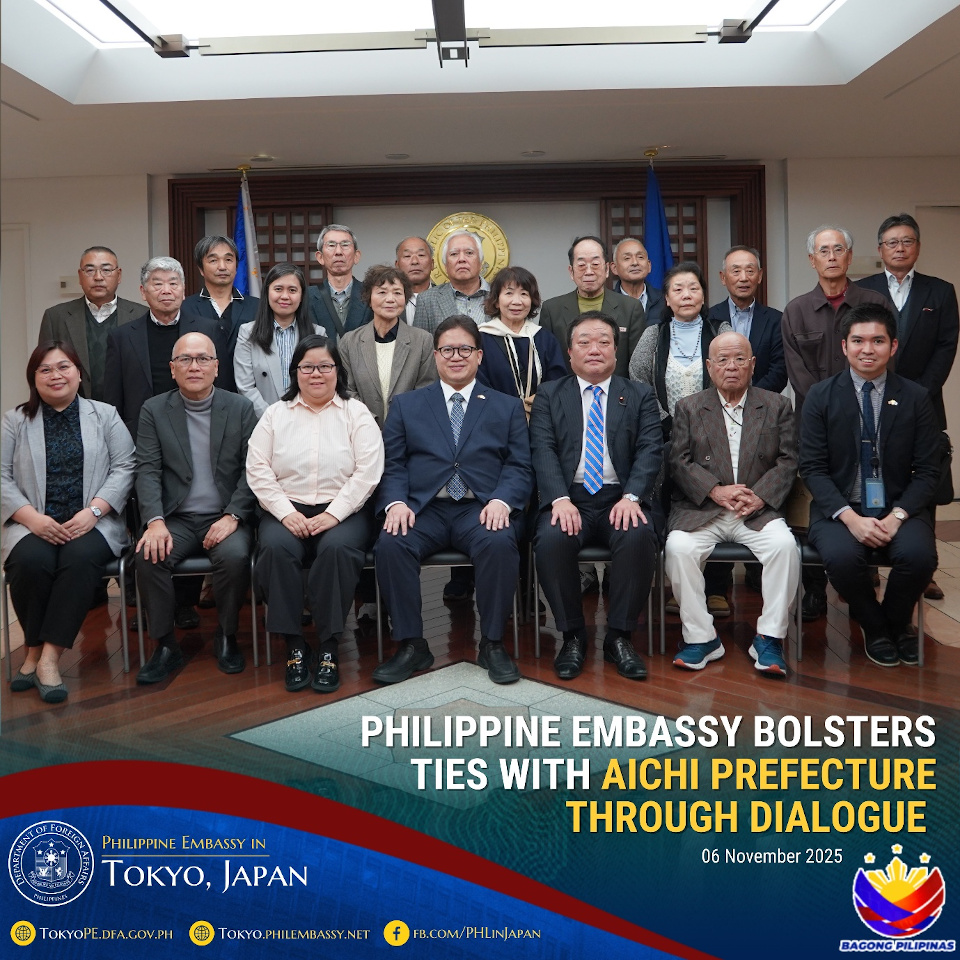 On behalf of Philippine Ambassador to Japan Mylene J. Garcia-Albano, Deputy Chief of Mission Christian L. de Jesus conveyed appreciation for the message of solidarity and the Aichi delegation’s interest in strengthening cooperation and understanding between Japanese communities and Filipino residents in Aichi. Also present at the dialogue were Acting Consul General Mary Joy B. Ramirez, Labor Attaché Ramon Lamberto C. Pastrana, Social Security System (SSS) Representative Kathryn Quinn E. Eusuya, and Public Diplomacy Officer Antonio Emmanuel R. Miranda. END