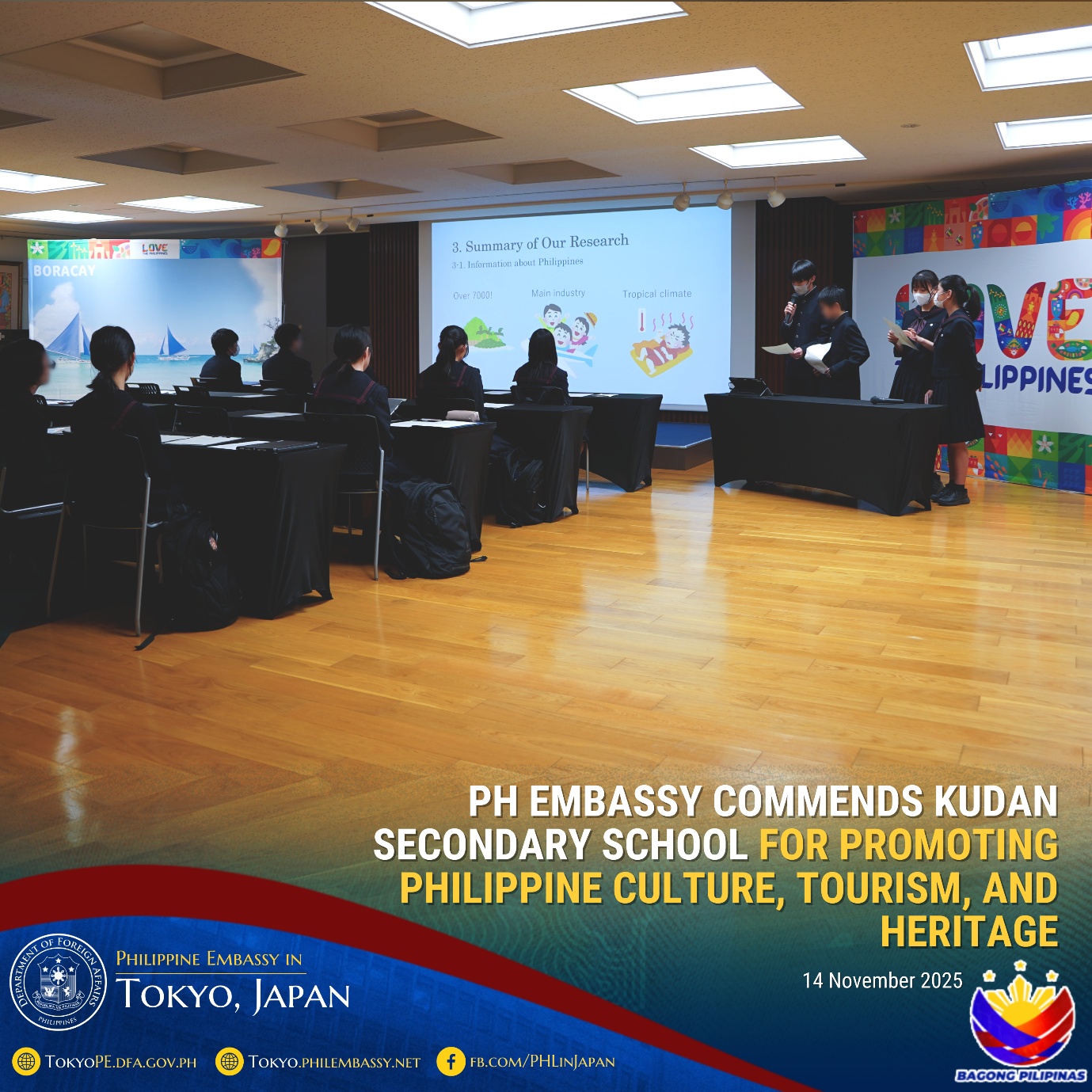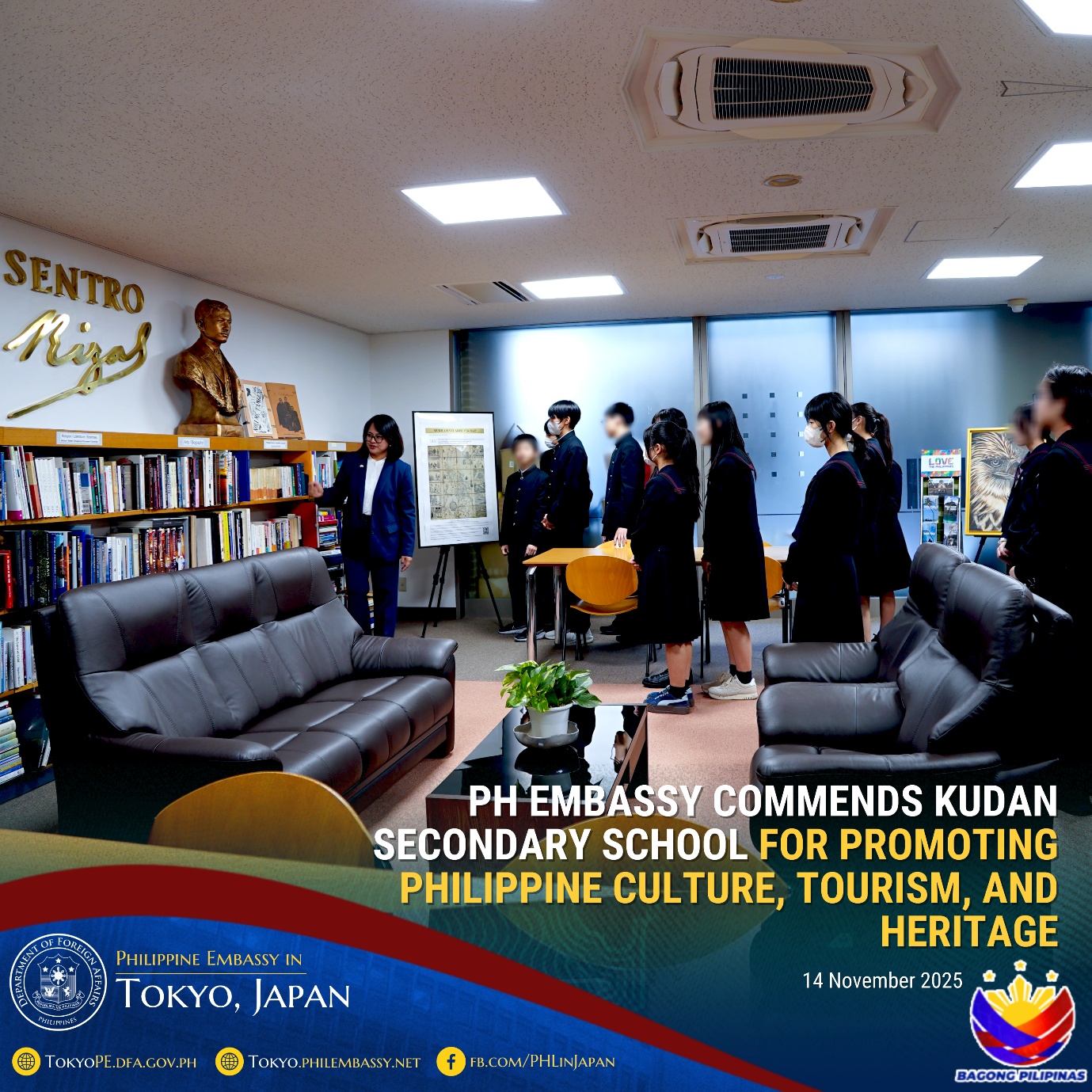 TOKYO, 21 November 2025 – To further expand its cultural education series under Sentro Rizal-Tokyo, and as part of its public diplomacy work, the Philippine Embassy welcomed students from Kudan Secondary School on 14 November 2025 for a cultural presentation, and consultation on the students’ Philippine promotions project.